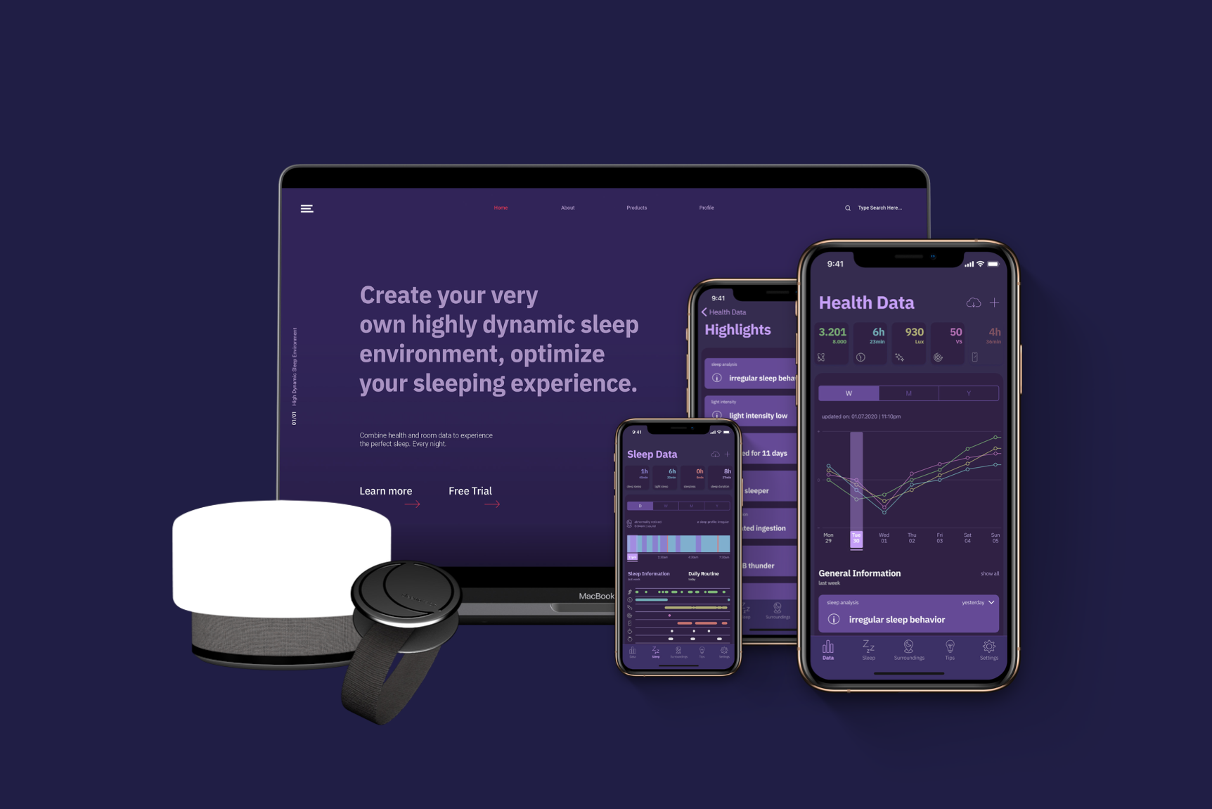 The sleeno ecosystem encompasses a phone app, a sleep tracker, and a smart sleep station for the home. With sleeno, you receive information and change instructions for your daily routine and can control linked room elements or adapt them to your individual sleeping behavior based on the data collected by the system components SleenoApp and SleenoHabit through SleenoSphere.